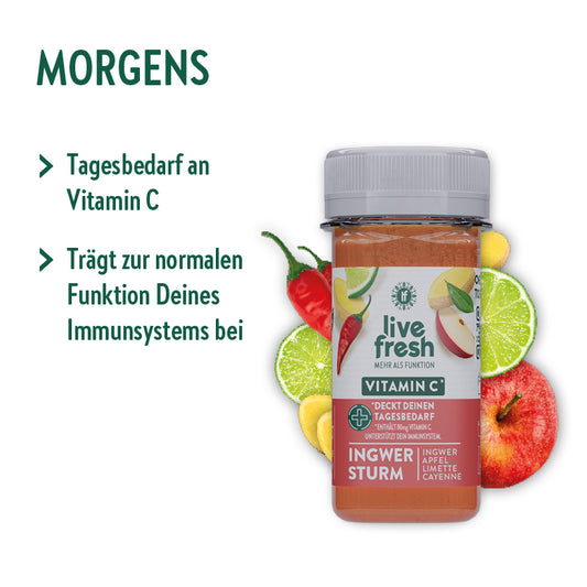 Die LiveFresh Shotkuren wurden entwickelt, um Deinen Körper mit Vitamin C und Vitamin D im Herbst und Winter zu unterstützen. Unsere Immun Shots versorgen Dich auf natürliche Weise mit den Vitaminen C und D – die Dein Körper in der kalten Jahreszeit besonders benötigt. Zusätzlich empfehlen wir eine ausgewogene Ernährung, ausreichend Wasser zu trinken und regelmäßige Bewegung an der frischen Luft, um Dein Immunsystem ideal auf die Winterzeit vorzubereiten.
