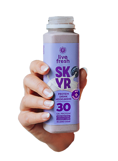 Unser Skyr Drink kombiniert hochwertige, natürliche Zutaten wie Skyr mit Fruchtpüree (Heidelbeere, Maracuja oder Kirsche) und einer speziellen Kollagenhydrolysatmischung. Er bietet einen hohen Proteingehalt von 30g pro Portion, ist „Lower Carb“ und kommt ohne Zuckerzusatz* aus. Diese Kombination macht ihn zur perfekten Wahl für einen aktiven und gesundheitsbewussten Lebensstil.