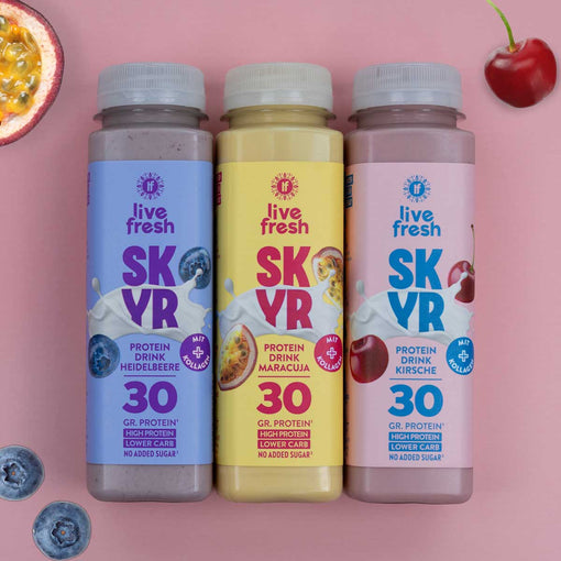 - 3 verschiedene Sorten Skyr Drinks: Heidelbeere, Kirsche & Maracuja